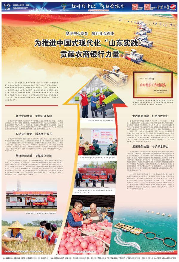 4月2日,“2022山东社会责任企业(企业家)”发布暨“2023山东社会责任企业(企业家)”推选活动启动仪式在济南举行。省联社荣获“2022山东社会责任企业”。 2022年,全省农商银行认真学习宣传贯彻党的二十大精神,紧紧围绕省委、省政府工作要求,不断巩固深化省联社党委“123456”总体工作思路,始终聚力全面加强党的建设,始终聚力全面提升服务“三农”和实体经济质效,始终聚力全面深化改革,始终聚力全面加强风险管理,始终聚力全面转型发展,始终聚力全面增强服务功能,步入持续健康发展轨道。截至2022年末,全系统资产总额3.27万亿元,各项贷款余额1.77万亿元,各项存款余额2.65万亿元,为推动全省经济社会发展作出了贡献。省联社荣获“2022山东社会责任企业”。